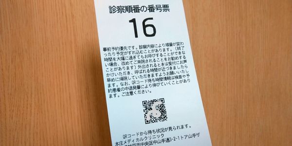来院時に、写真のような「診察順番の番号票」を発行しています。写真中央にありますQRコードにアクセスしていただきますと、待ち時間を確認していただけます。外出されるときは受付にひとことお声をかけいただき、呼ばれる時間が近づきましたら早めに帰院していただきますようお願いいたします。なお、QRコード待ち時間情報は検査や予約患者の中途発番により伸びていくことがあります。ご注意ください。